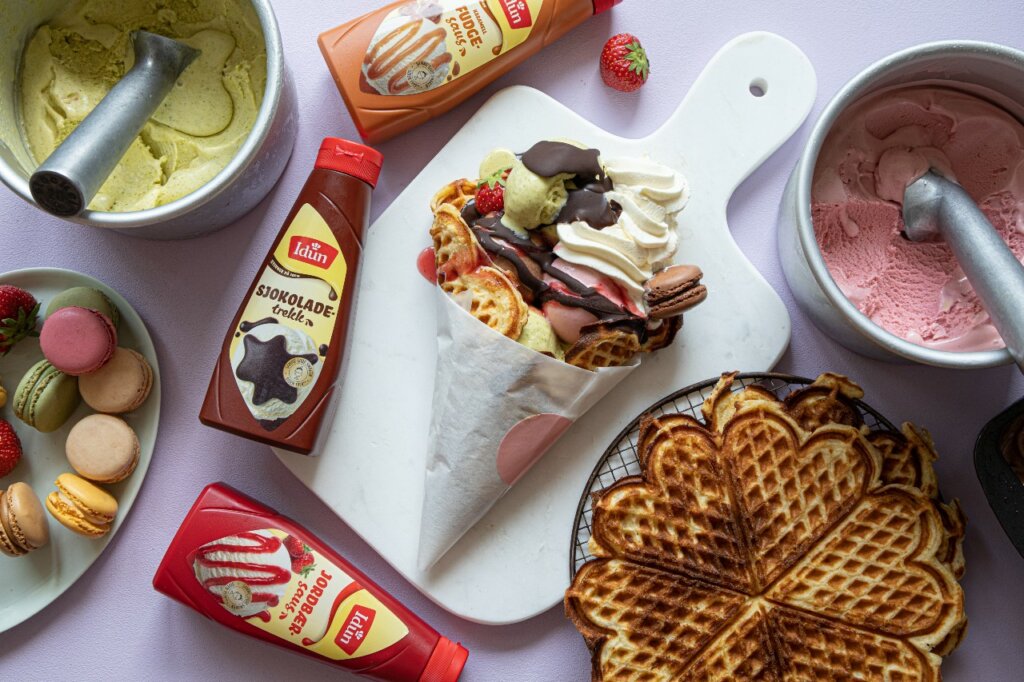 - Lag kremmerhus til vaflene med matpapir og klistemerker/teip. Rull vaffelen sammen i den ene enden og legg i kremmerhuset. Ha kuler med is i vaffelen og topp gjerne med friske bær, pisket krem og ikke minst gode iskremsauser.